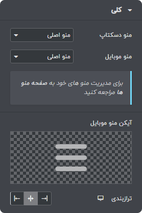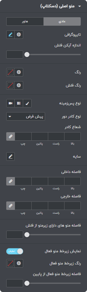 برای نمونه ما تصاویری از گزینه های سفارشی سازی المان منو را که از آن در هدر وبسایت استفاده نموده ایم را برای شما آماده کرده ایم.